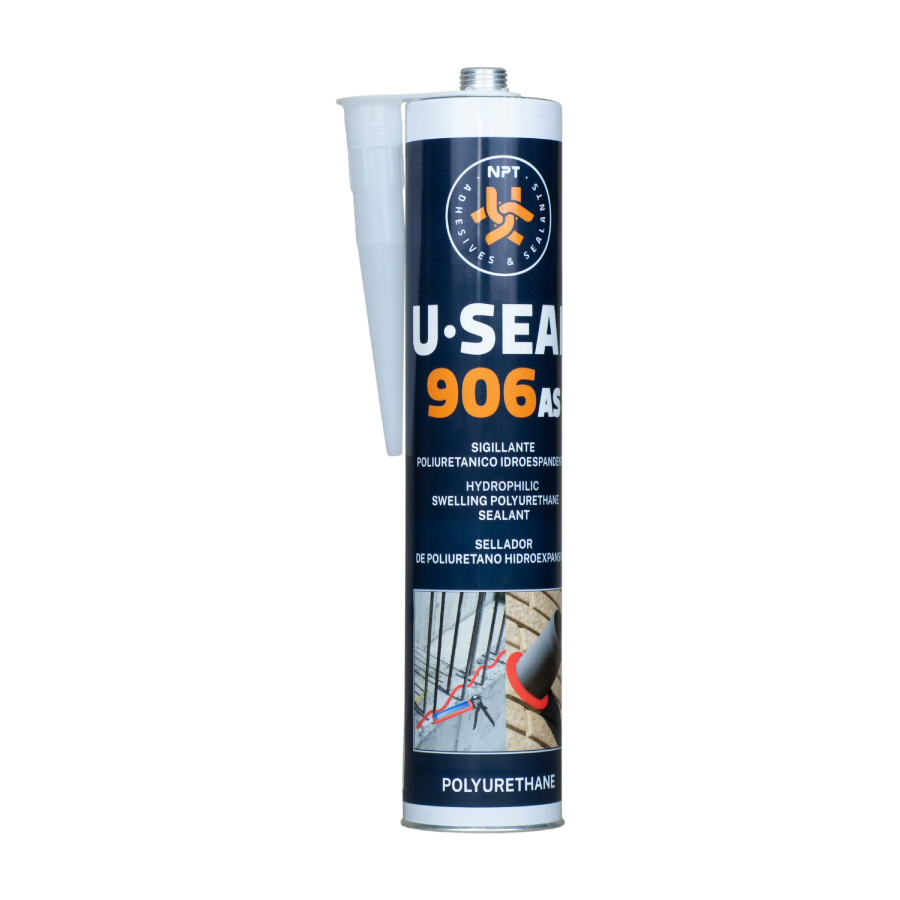 U-Seal 906 AS là một loại keo dán và sealant polyurethane một thành phần, có khả năng hút ẩm và phồng nở khi tiếp xúc với nước. Sản phẩm này chuyên dùng để chống thấm các mối nối bê tông, và khi gặp nước, nó sẽ chuyển thành chất bịt kín chịu được áp lực nước lên đến 5 bar. Có thể sử dụng với súng bơm keo thông thường mà không bị chảy xệ, U-Seal 906 AS tự kết dính dưới tác động của độ ẩm không khí hoặc bê tông để bịt kín các loại mối nối xây dựng hoặc thủy lực, và có khả năng phồng nở khi tiếp xúc với nước, ngay cả trong các chu kỳ ngập nước. Sản phẩm được chứng nhận theo các tiêu chuẩn sau: